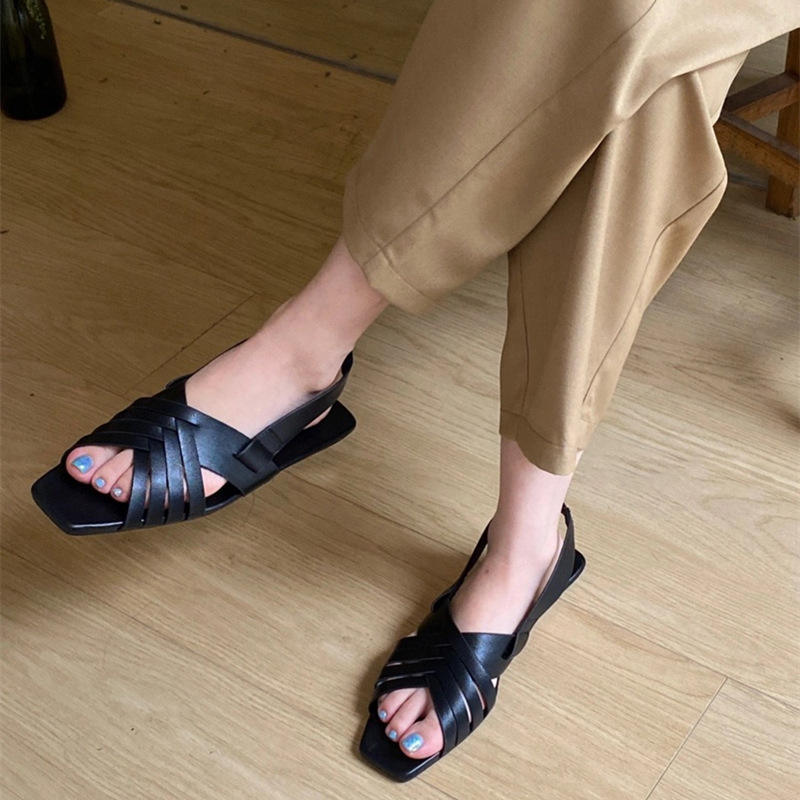 รองเท้าสานหนังแท้รักษ์โลก 100% แบบสวมเปิดนิ้วเท้า ส้นแบน สายรัดกว้าง สำหรับผู้หญิง ใส่เดินเล่นกลางแจ้ง ผลิตจากโรงงาน