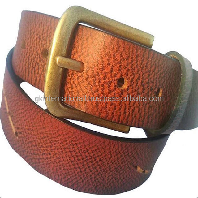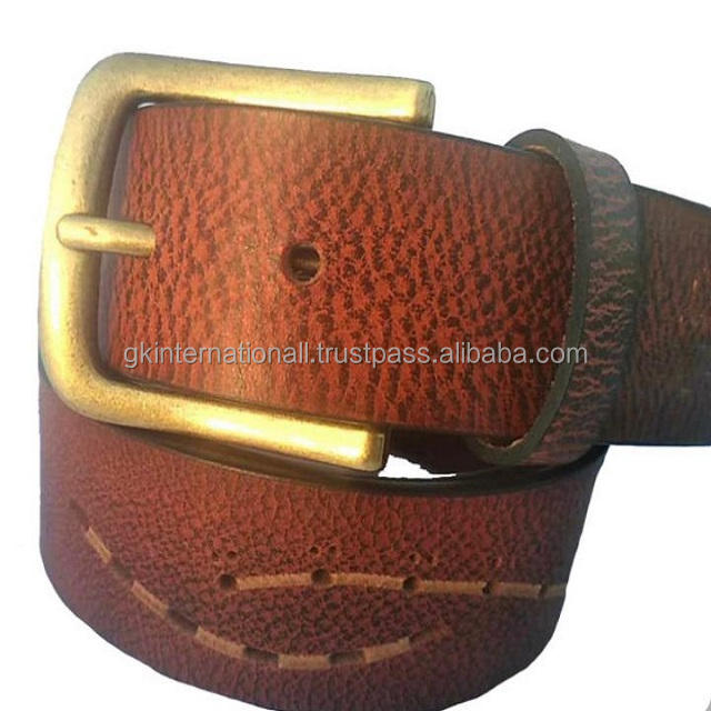 เข็มขัดหนังแท้แบบเต็มเมล็ด100%,เข็มขัดแฮนด์เมดสีน้ำตาลตาลทนทานดีไซน์เนอร์เย็บด้านข้างพร้อมหัวเข็มขัดสีทอง