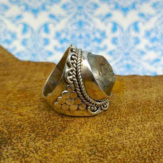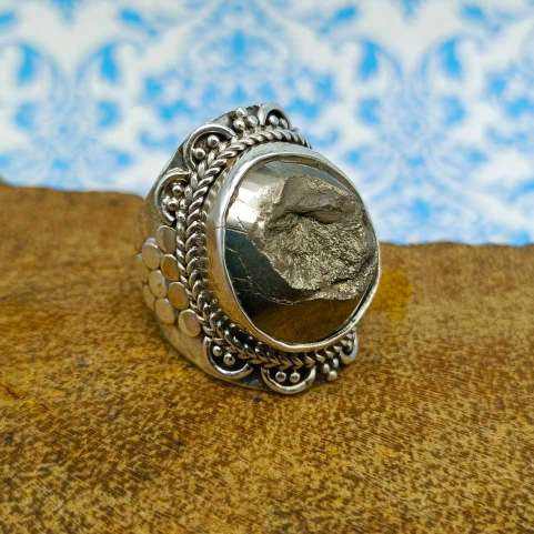 แหวนพลอยไพไรต์ธรรมชาติแท้100% สำหรับผู้ชายและผู้หญิงแหวนเงินโลหะทรงกลมสีเทา