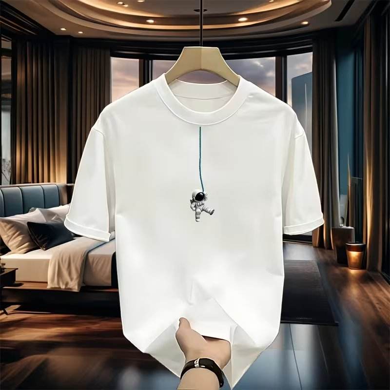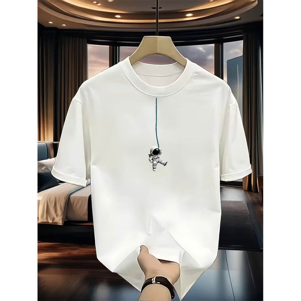 เสื้อยืดผู้ชาย Wu Jianzhan ทรงปกติ แขนสั้น ผ้าคอตตอนหนา พิมพ์ลายกราฟิกนักบินอวกาศและโลก ซักเครื่องได้ สไตล์ลำลอง