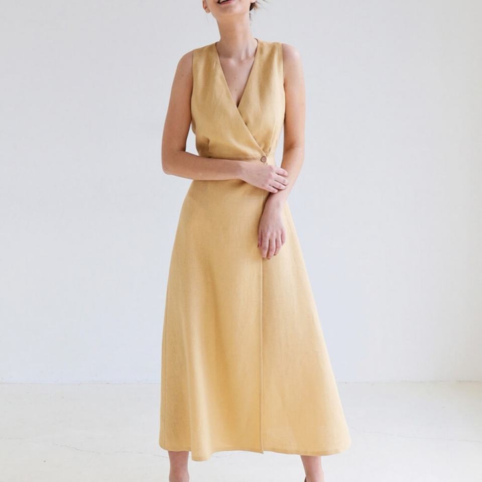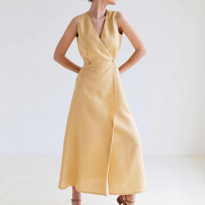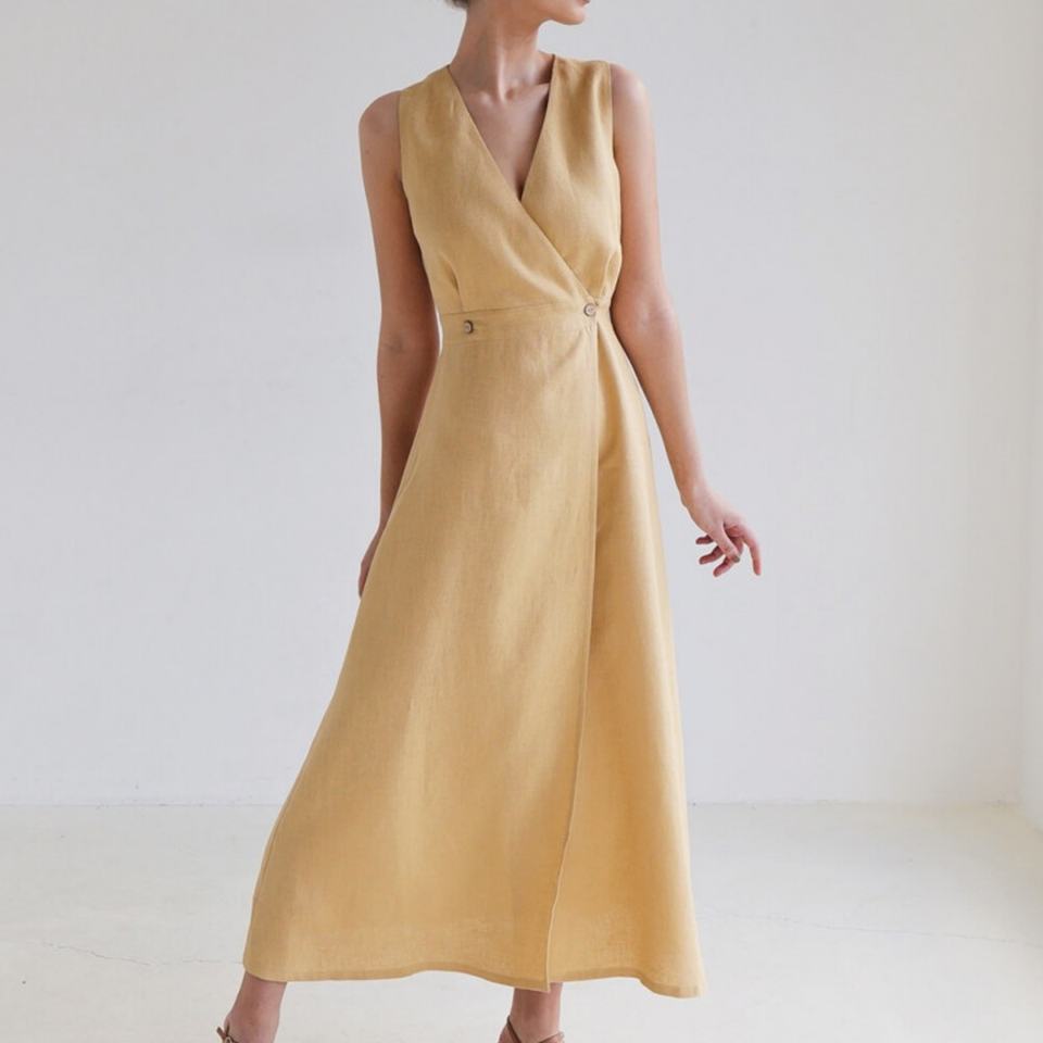 ชุดเดรสผ้าลินิน 100% แขนกุด คอวี เอวสูง ความยาวปานกลางสำหรับผู้หญิง