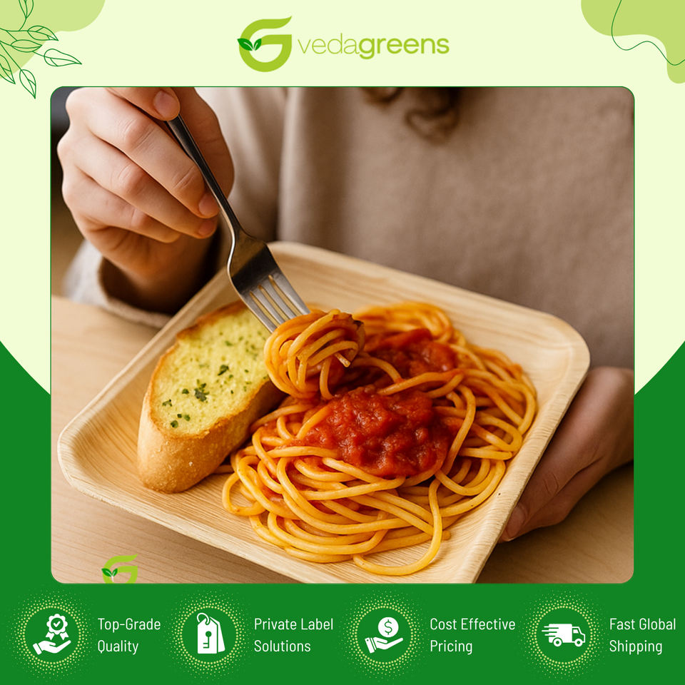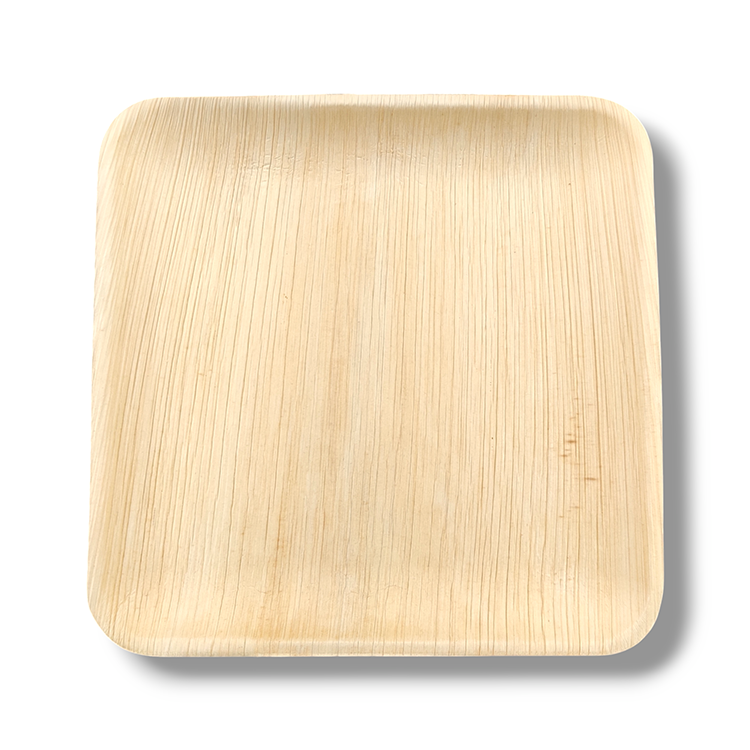 ผลิตจากวัสดุธรรมชาติ 100% และย่อยสลายได้ ผลิตในอินเดีย จานสี่เหลี่ยมจากปาล์มอะเรก้าคุณภาพสูง มีจำหน่ายหลายขนาด