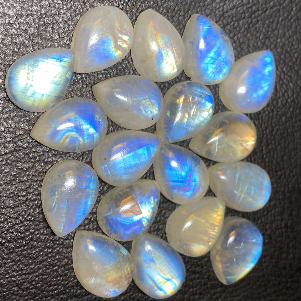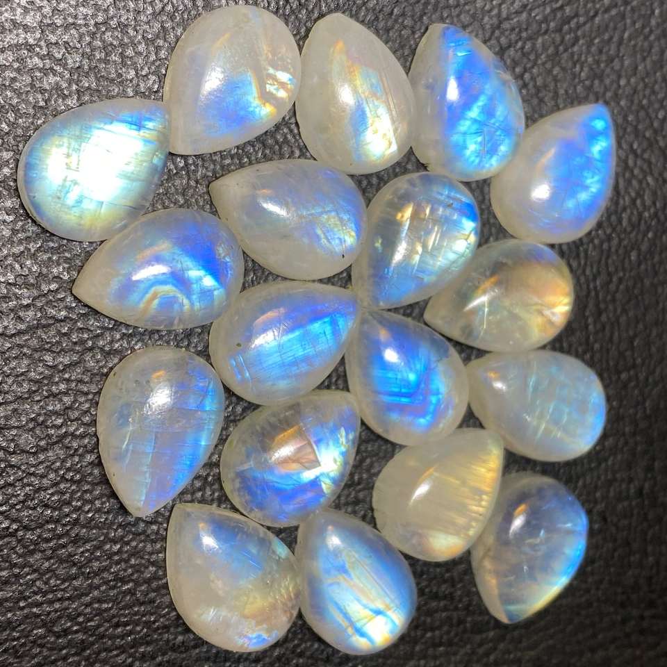 พลอยมูนสโตนธรรมชาติขัดเงาด้วยมือ100% อัญมณีทรงหลวมรูปทรงลูกแพร์มูนสโตนสีรุ้งที่น่าทึ่งสำหรับทำเครื่องประดับอินเทรนด์