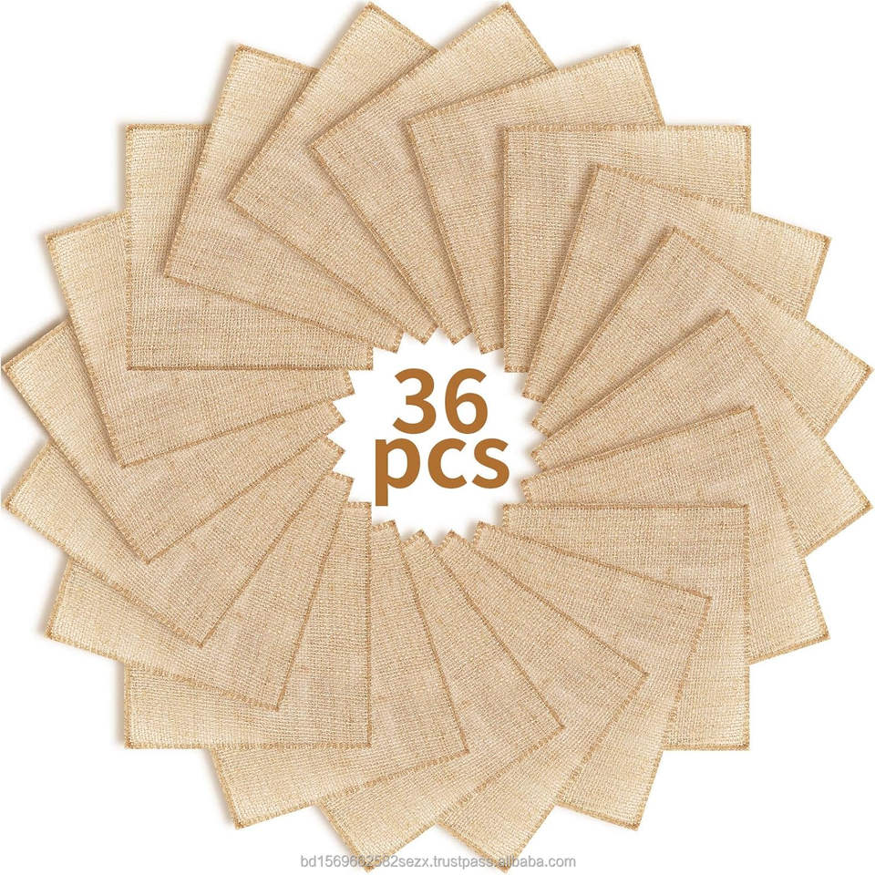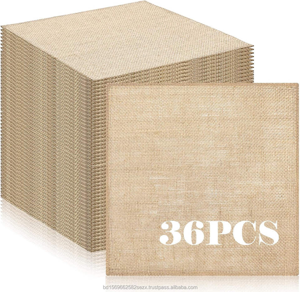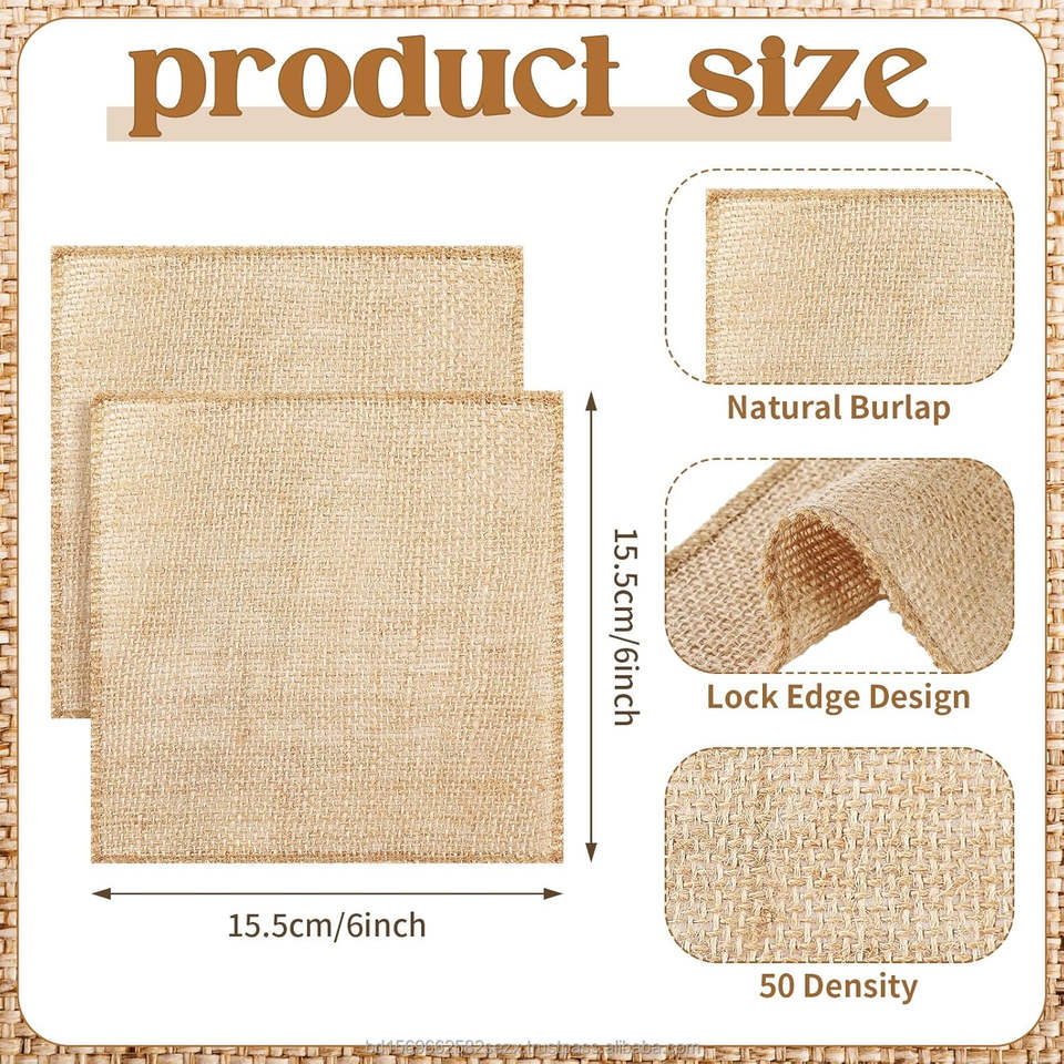 ผ้ากระสอบป่านธรรมชาติ 100% เป็นมิตรกับสิ่งแวดล้อม ทนทาน ย่อยสลายได้ ขนาด 6x6 นิ้ว หนัก 9 ออนซ์ ใช้ปูโต๊ะสำหรับงานแต่งงาน