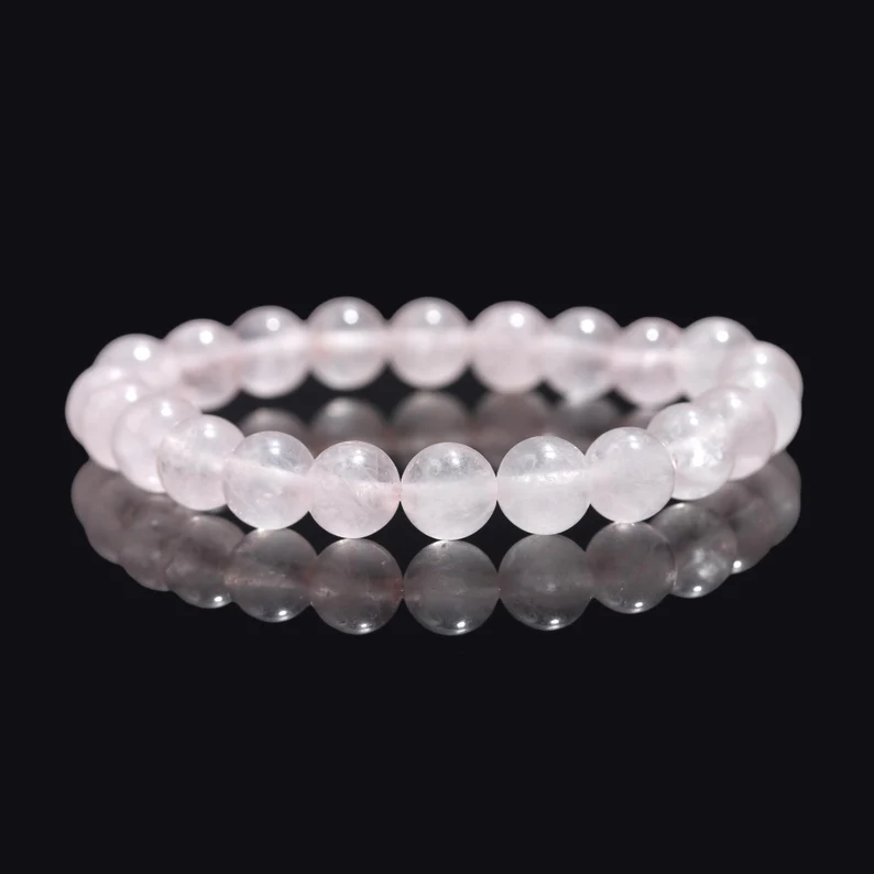 สร้อยข้อมือลูกปัดคริสตัลโรสควอตซ์จากธรรมชาติคุณภาพระดับพรีเมี่ยมจาก100% กำไลข้อมือสำหรับการทำสมาธิหินยืดเครื่องประดับมันเงา