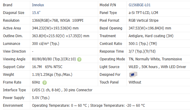 หน้าจอ LCD อุตสาหกรรม Innolux ขนาด 15.6 นิ้ว ความละเอียด 1920x1080 (1366*768) ความสว่าง 300nits พร้อมไดรเวอร์ LED และอินเทอร์เฟซ LVDS ของใหม่ 100%