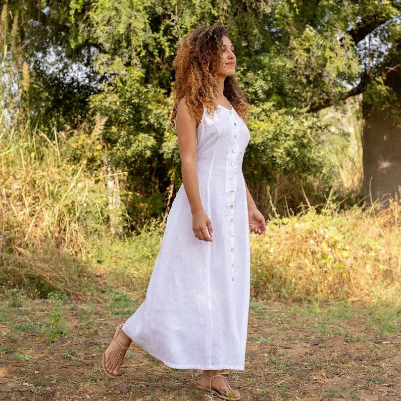 เดรสโบฮีเมียนผ้าลินิน 100% เป็นมิตรกับสิ่งแวดล้อม ซักได้ ระบายอากาศดี ทรงเปิดไหล่ แขน 3/4 ติดกระดุมด้านหน้า ยาวแบบแม็กซี่
