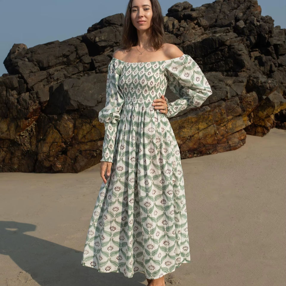 ชุดเดรสเปิดไหล่สำหรับผู้หญิงชุดเดรสผ้าฝ้ายออร์แกนิกแขนยาวสวมใส่สบายออกแบบได้ตามต้องการ