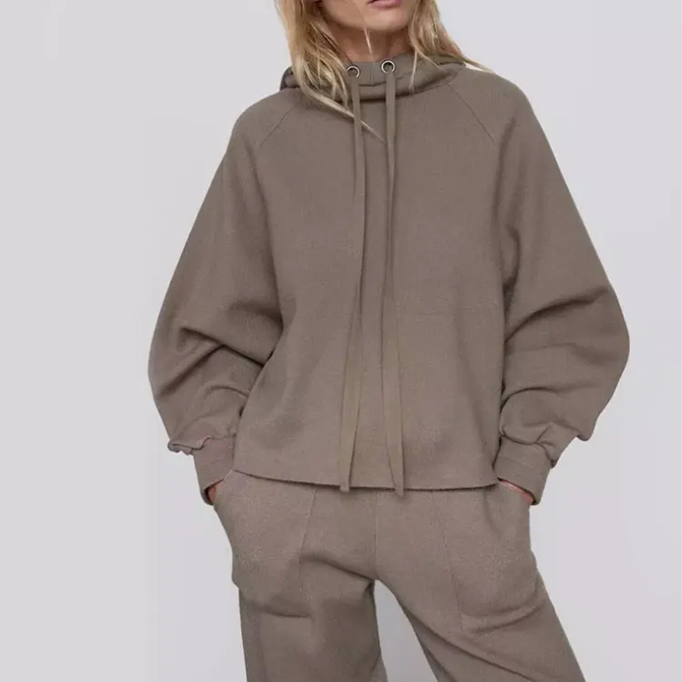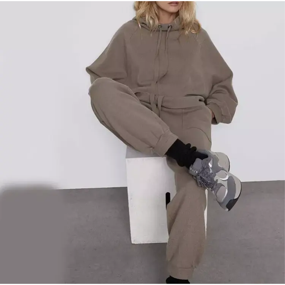 ชุดวอร์มผ้าฝ้ายออร์แกนิกสำหรับผู้หญิงมีฮู้ดสองชิ้นชุดวอร์มผ้าฟลีซแบบผูกเชือก100%