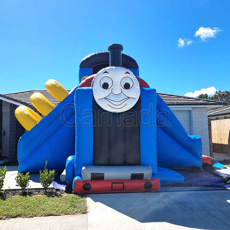 บ้านลมเป่าลมรูปรถไฟ 100% PVC สำหรับเด็กเล่นกลางแจ้ง พร้อมสไลเดอร์รถไฟโทมัส