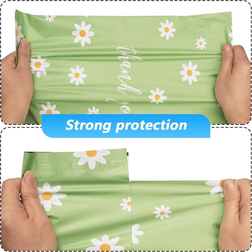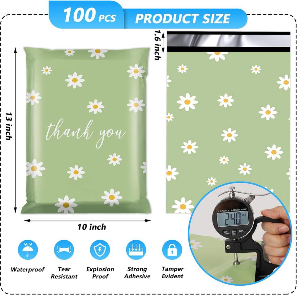 100 แพ็ค ถุงโพลีเมลเลอร์ขอบคุณ 25x33 ซม. ปิดผนึกด้วยตนเอง กันน้ำ ทนต่อการฉีกขาด ทนทาน 2.3M สีเขียว ลายดอกเดซี่