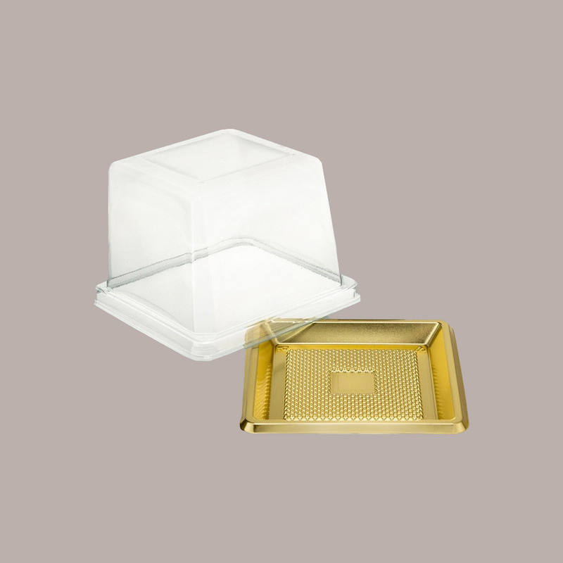 LUCGEL ถาดเสิร์ฟพลาสติกทรงสี่เหลี่ยมสีทองขนาดเล็ก 100 ชิ้น พร้อมฝาปิด 9.5x9.5 ซม. รหัส 08765