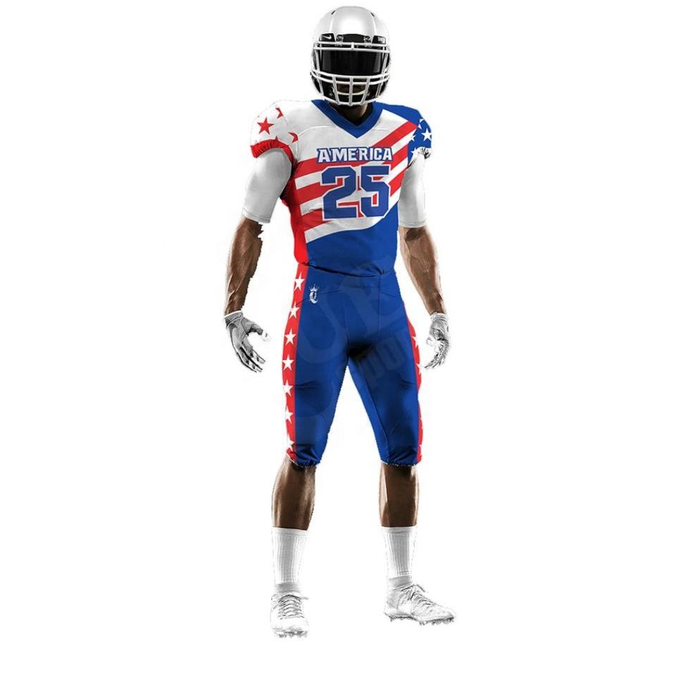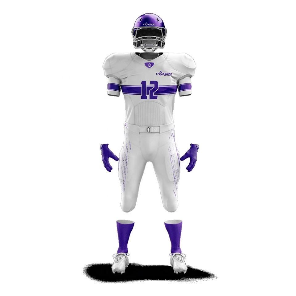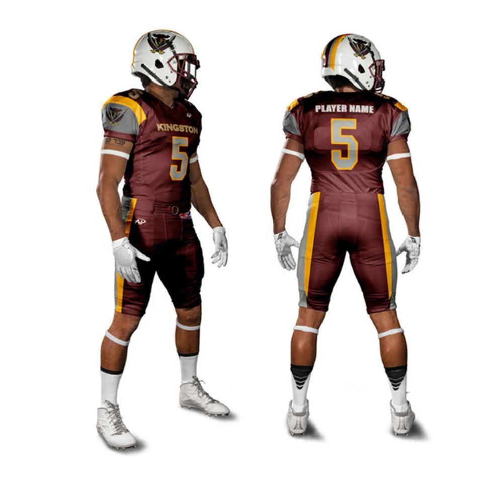 ชุดเครื่องแบบฟุตบอลอเมริกันโพลีเอสเตอร์100% เสื้อเจอร์ซีย์ปักพื้นสั้นระบายอากาศป้องกันรังสียูวีแห้งเร็ว