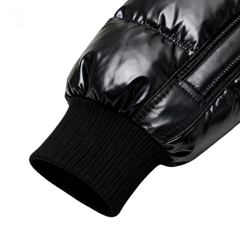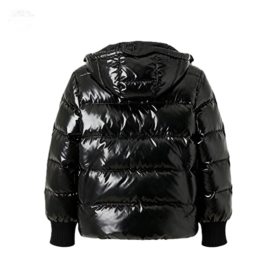 เสื้อแจ็คเก็ตเด็กแบบ unisex สีดำ เงา กันน้ำ ระบายอากาศได้ดี บุใยโพลีเอสเตอร์ 100% แบบพองตัว พร้อมฮู้ดถอดได้ สำหรับฤดูหนาว รับผลิตแบบ OEM ODM