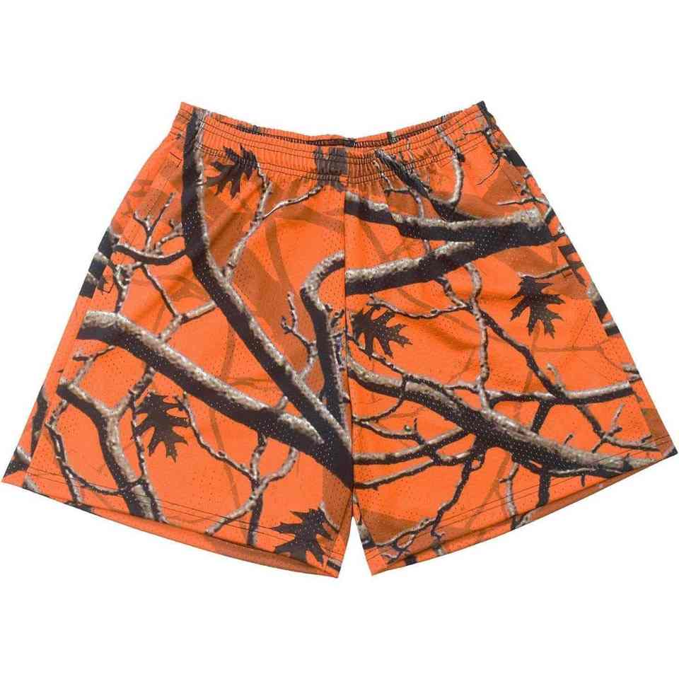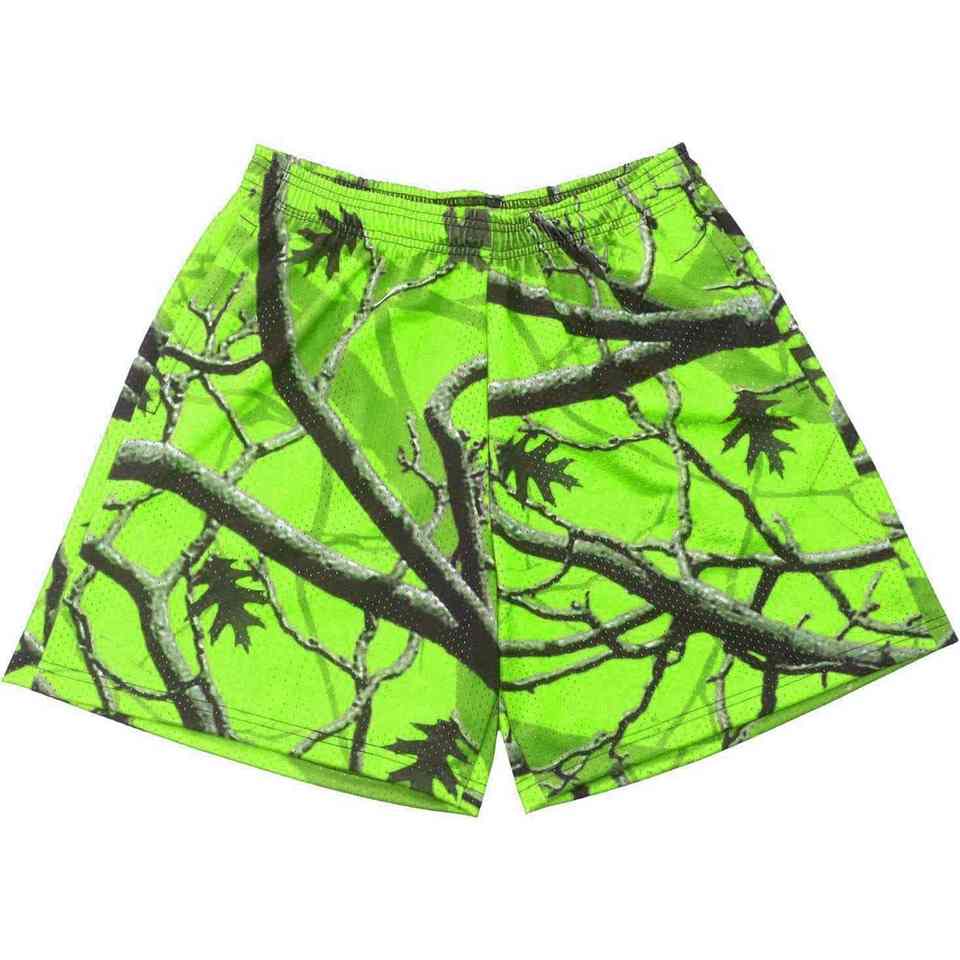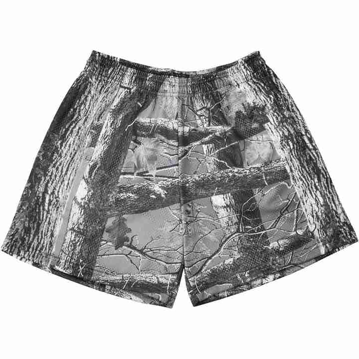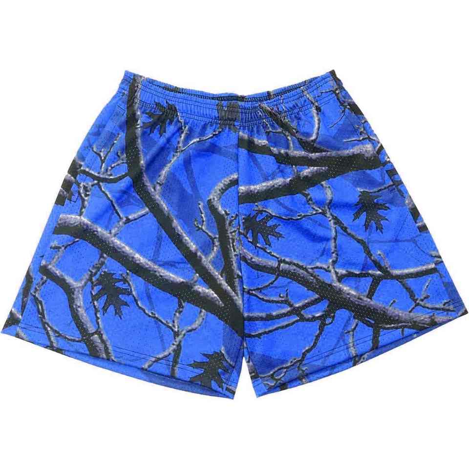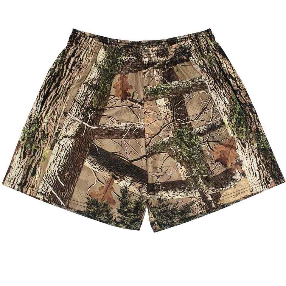 กางเกงขาสั้นตาข่ายลายพรางต้นไม้แบบกำหนดเอง ความยาวขาใน 5 นิ้ว สำหรับผู้ชายและผู้หญิง ผ้าโพลีเอสเตอร์ 100% หนานุ่มพิเศษ พิมพ์ลายแบบ Sublimation ทั้งตัว เหมาะสำหรับฤดูร้อน