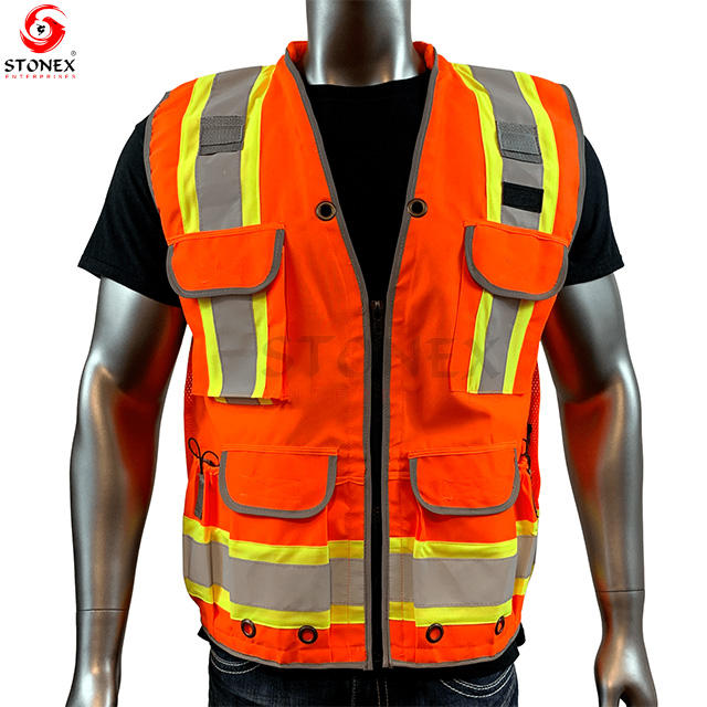 เสื้อกั๊กและแจ็กเก็ตสำหรับผู้ชายเสื้อนิรภัยผ้าโพลีเอสเตอร์สีส้มแบบมีหลายกระเป๋ามีซิปสะท้อนแสง