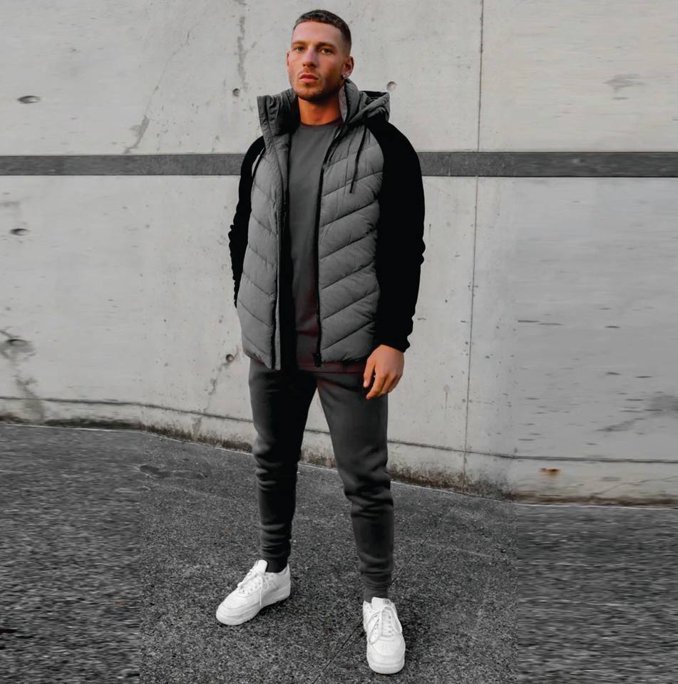 เสื้อแจ็คเก็ตบุสองชั้นผ้าโพลีเอสเตอร์100% แขนแร็กแลนและแขนผูกกับกระดูกสีเทามีกระเป๋าซิปและกระเป๋าด้านใน