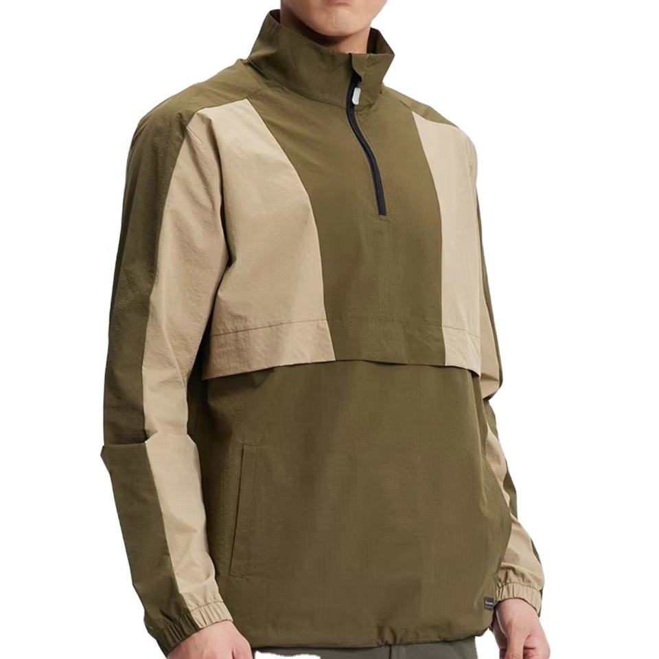 แจ็คเก็ตกันลมสำหรับผู้ชายโพลีเอสเตอร์100% มีซิปด้านหน้าแห้งเร็วดีไซน์1/4สำหรับเล่นกีฬาออกกำลังกายกันน้ำคอตั้งเย็บต่อกัน
