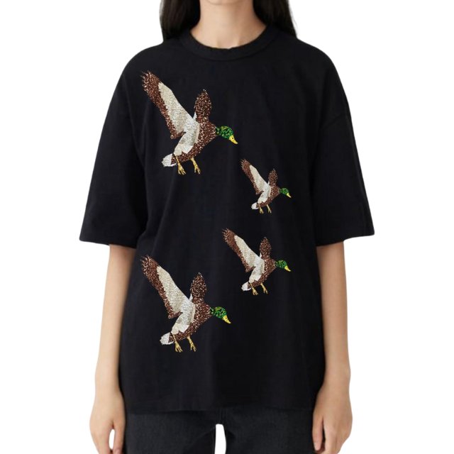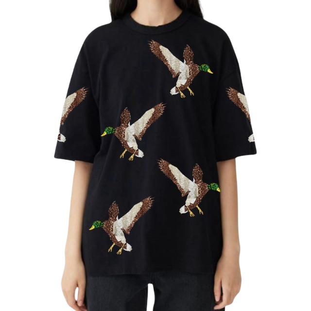 เสื้อยืดปักเลื่อมงานทำมือสำหรับผู้หญิงทรงหลวมลายนกเป็ดน้ำแบบลำลองออกแบบได้ตามต้องการ