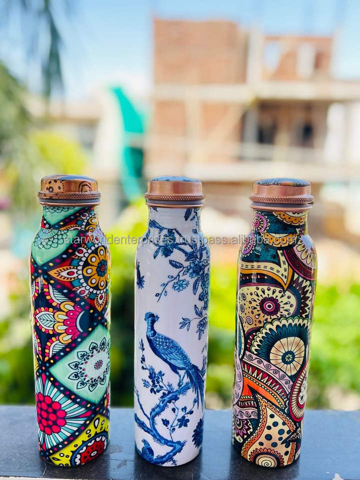 ขวดน้ำทองแดงบริสุทธิ์สำหรับยิมขวดน้ำสำหรับการเดินทางและเล่นกีฬา100% พิมพ์ลายอินเดียขวดน้ำแบบพกพาผลิตในอินเดีย