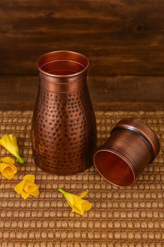 ขวดน้ำทองแดงแท้ 100% ขวดน้ำแบบตีด้วยมือตามหลักอายุรเวท เป็นมิตรกับสิ่งแวดล้อม ป้องกันการรั่วซึม ขวดน้ำสำหรับเดินทาง มีตัวเลือกแบบเหยือกและแก้ว