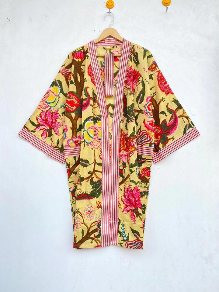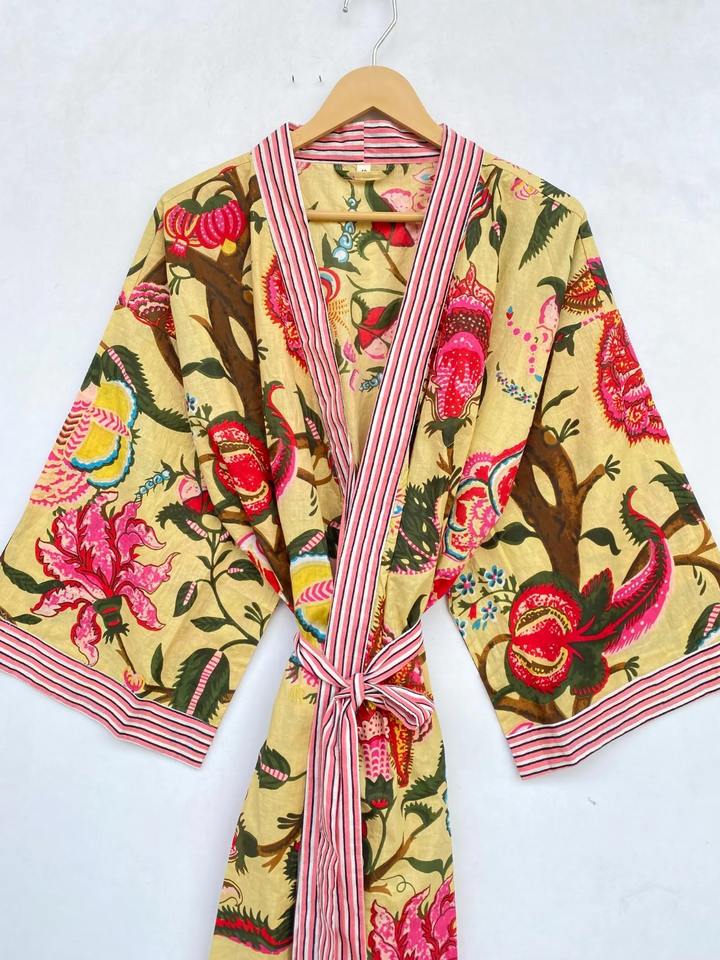 100% กิโมโนผ้าคอตตอนแท้ระบายอากาศคอวีความยาวเต็มตัวพิมพ์ลายนกเสื้อคลุมชุดใส่ได้ทั้งชายและหญิงชุดใส่กลางคืนชุดใส่เที่ยวทะเล