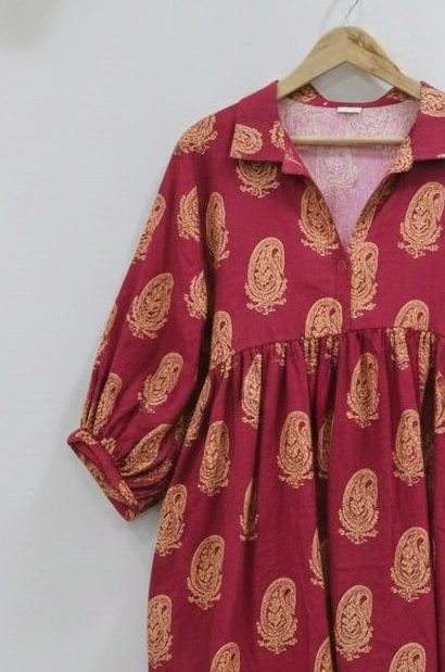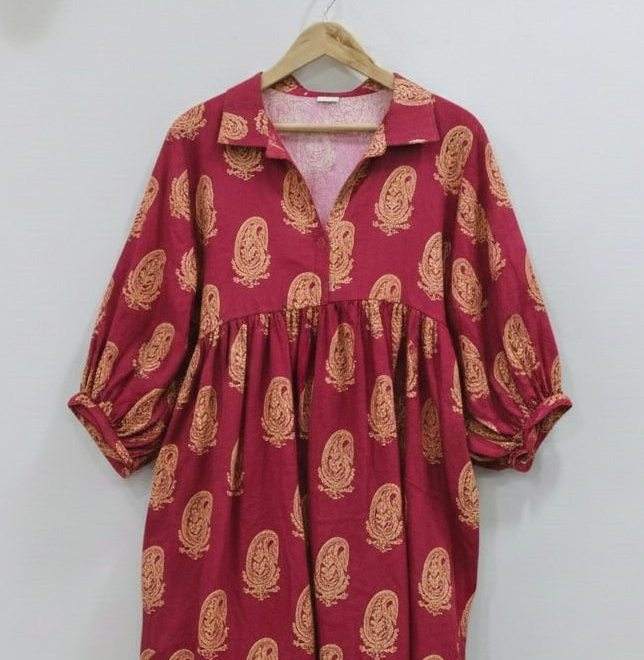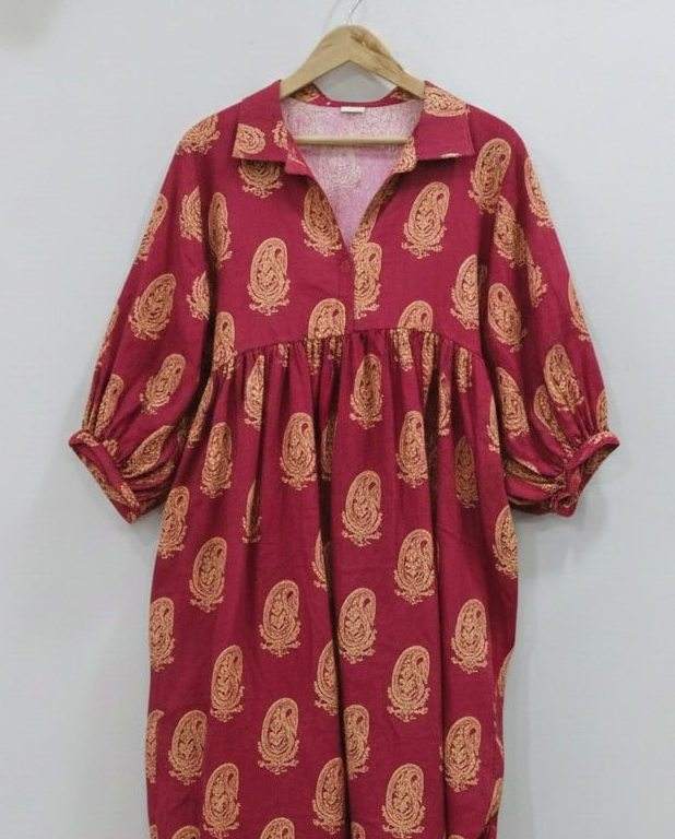 ชุดเดรสยาวปานกลาง/ยาวแบบมิดิ ผ้าฝ้ายแท้ 100% ทำมือ เป็นมิตรกับสิ่งแวดล้อม ระบายอากาศได้ดี ลายดอกไม้ เอวธรรมชาติ ทรงเอ คอวี แขนพอง ย้อมสีแบบไทได