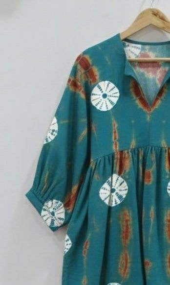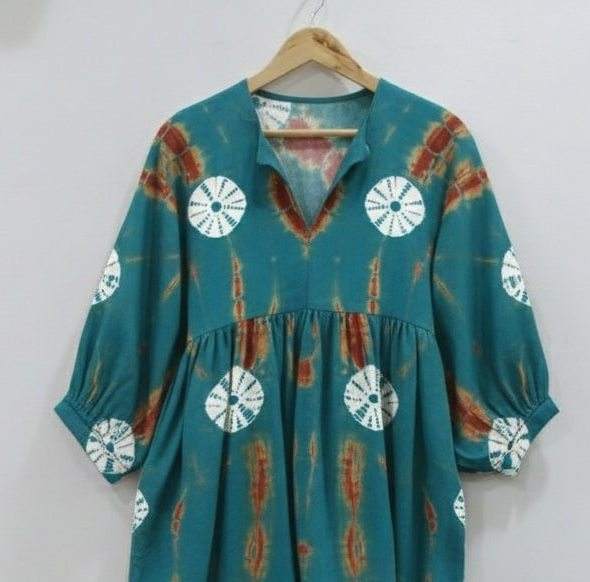 ชุดเดรสยาวสไตล์ฮิปปี้ ทำจากผ้าฝ้ายแท้ 100% ทำมือ เป็นมิตรกับสิ่งแวดล้อม ทรงเอไลน์ ผูกเอว ย้อมสีแบบไทได ความยาวปานกลาง เหมาะสำหรับใส่ทำงาน