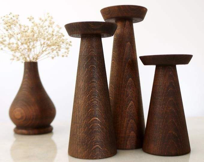 เชิงเทียนไม้แท้ 100% รักษ์โลก สไตล์วินเทจคลาสสิก ขัดเงา ชุด 3 ชิ้น อุปกรณ์ตกแต่งเชิงเทียนไม้สำหรับเดือนรอมฎอน