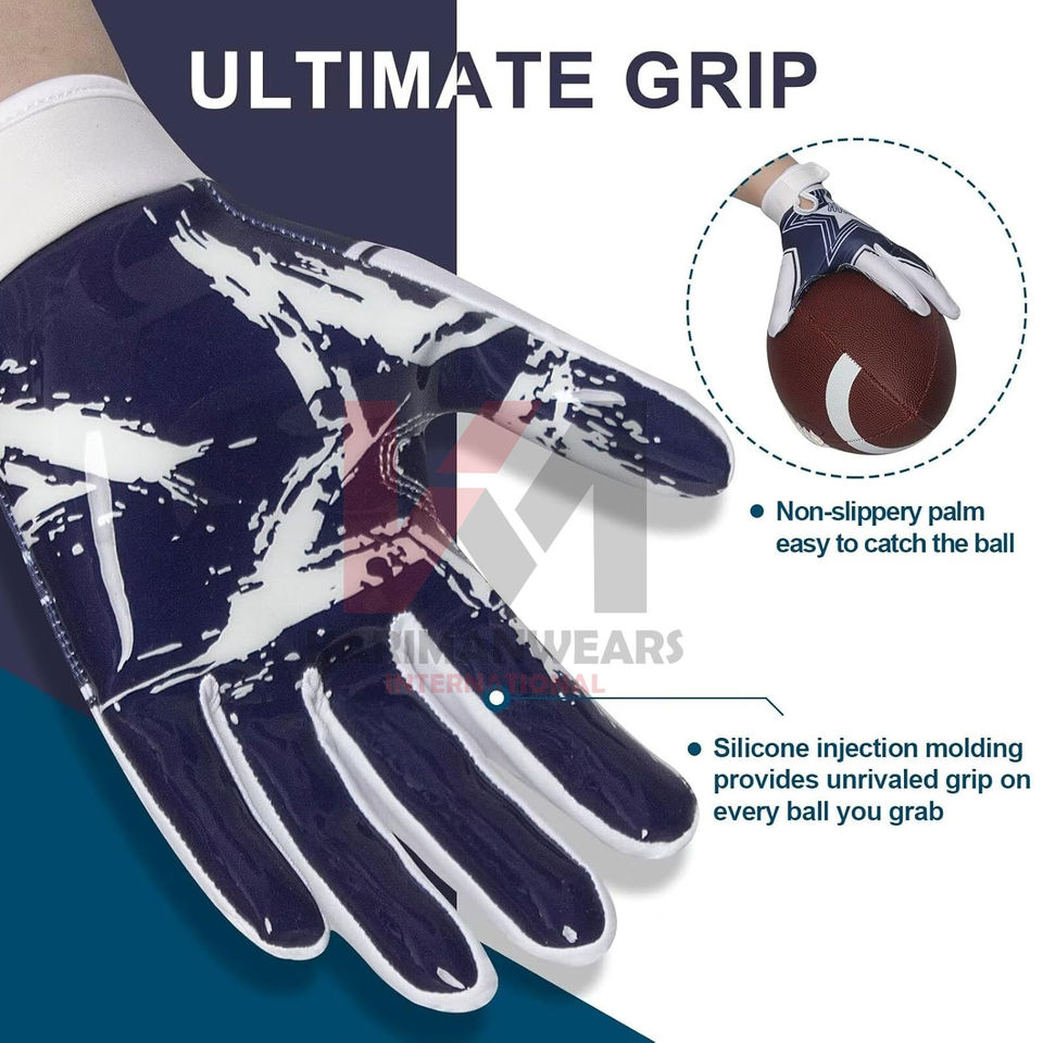 ถุงมืออเมริกันฟุตบอลคุณภาพสูง 100% ออกแบบโลโก้ได้ตามต้องการ ฝ่ามือซิลิโคนเหนียวพิเศษ ป้องกันการลื่น