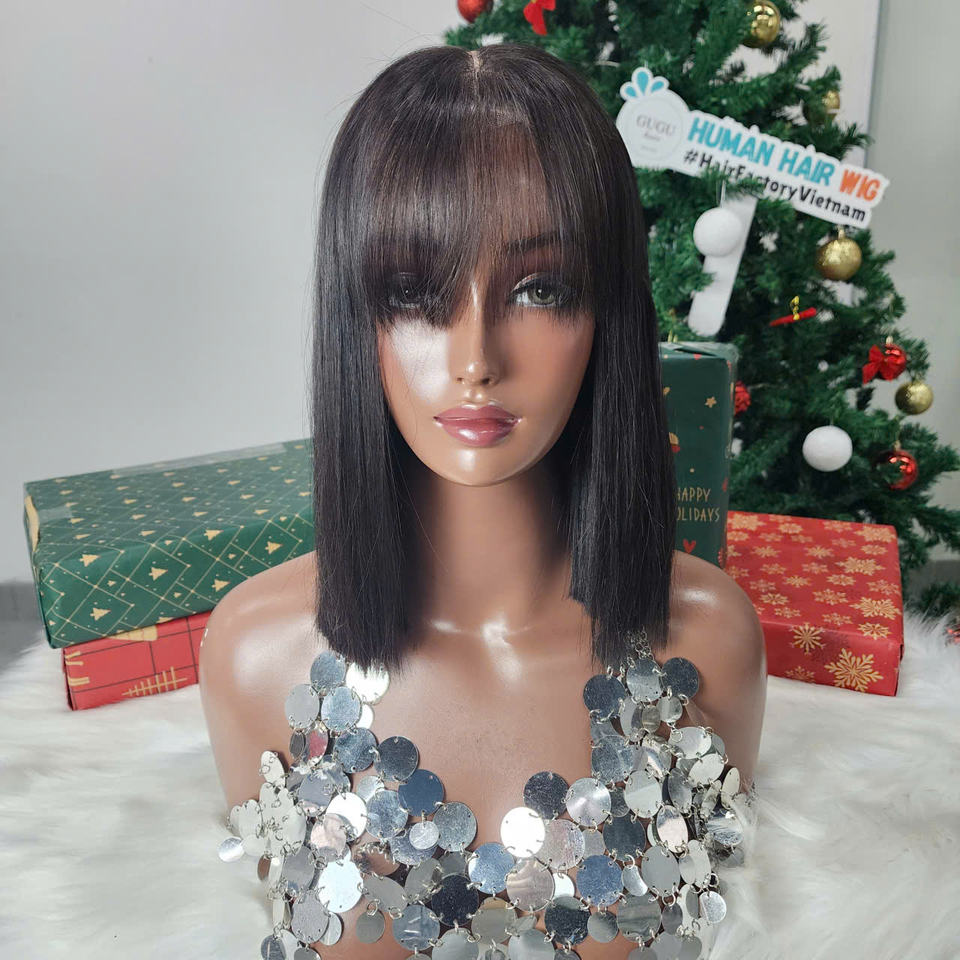 วิกผมหน้าม้าไร้กาว10นิ้วสำหรับผู้หญิงผิวดำวิกผมมนุษย์สี613แบบกำหนดเองได้หรูหราเวียดนาม100%