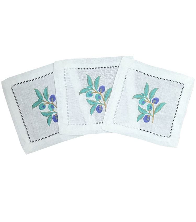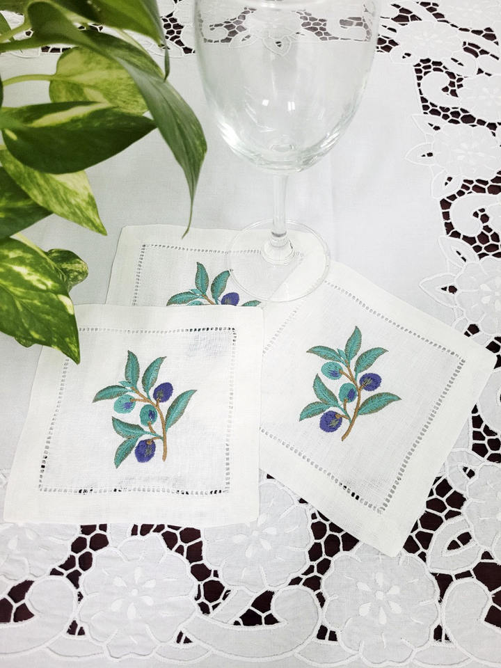 ผ้าเช็ดปากค็อกเทลผ้าลินินสีขาวงานปักด้วยมืองานปักลายกิ่งมะกอกสำหรับงานอีเวนต์บาร์ในบ้านโรงแรม