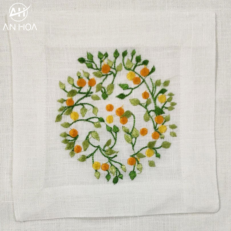 ผ้าเช็ดปากค็อกเทลผ้าลินินสีขาว100% สี่เหลี่ยม6 "* 6" พร้อมลายปักวงกลมดอกไม้สีส้ม