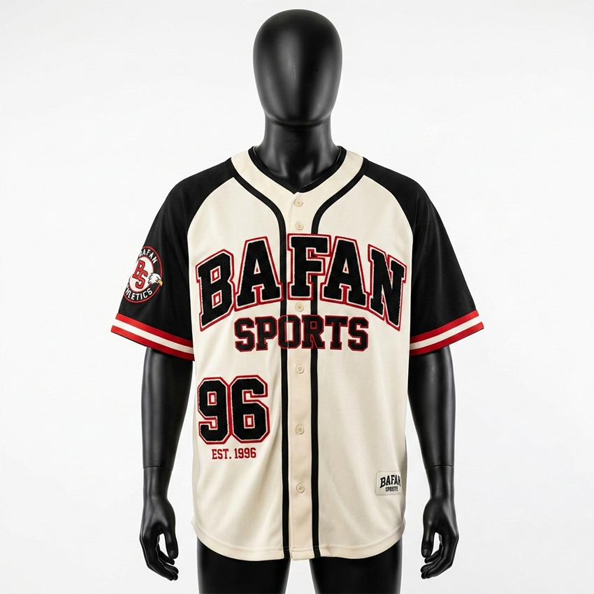 เสื้อยืดผู้ชายผ้าฝ้าย 100% ทรงหลวม พิมพ์ลาย เสื้อเบสบอลผ้าโพลีเอสเตอร์ตาข่ายพรีเมียม 200 GSM สีครีม แขนเสื้อสีดำแบบแร็กแลน