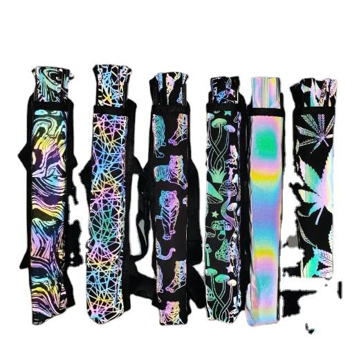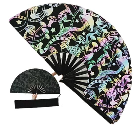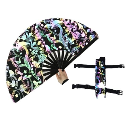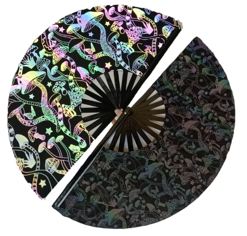100% in Stock Mushroom Pattern 33CM Length Reflective Fabric Black Bamboo Ribs Hand Fan for Large Rave Clack