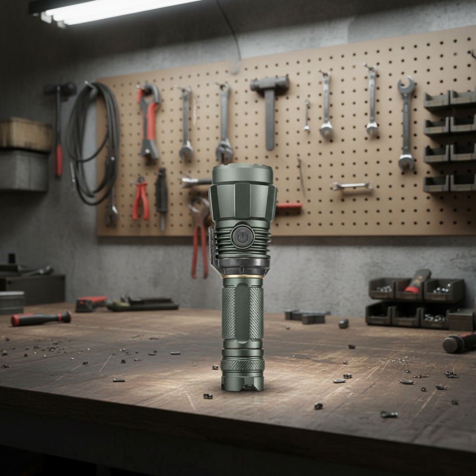 ไฟฉาย LED อลูมิเนียมแบบชาร์จไฟได้ผ่าน USB ความสว่าง 1000+ ลูเมน แบตเตอรี่ Li-ion กันน้ำระดับ IP68 แสงสีขาว 6000K 5 โหมด ปรับความสว่างได้ ระยะส่อง 2 เมตร