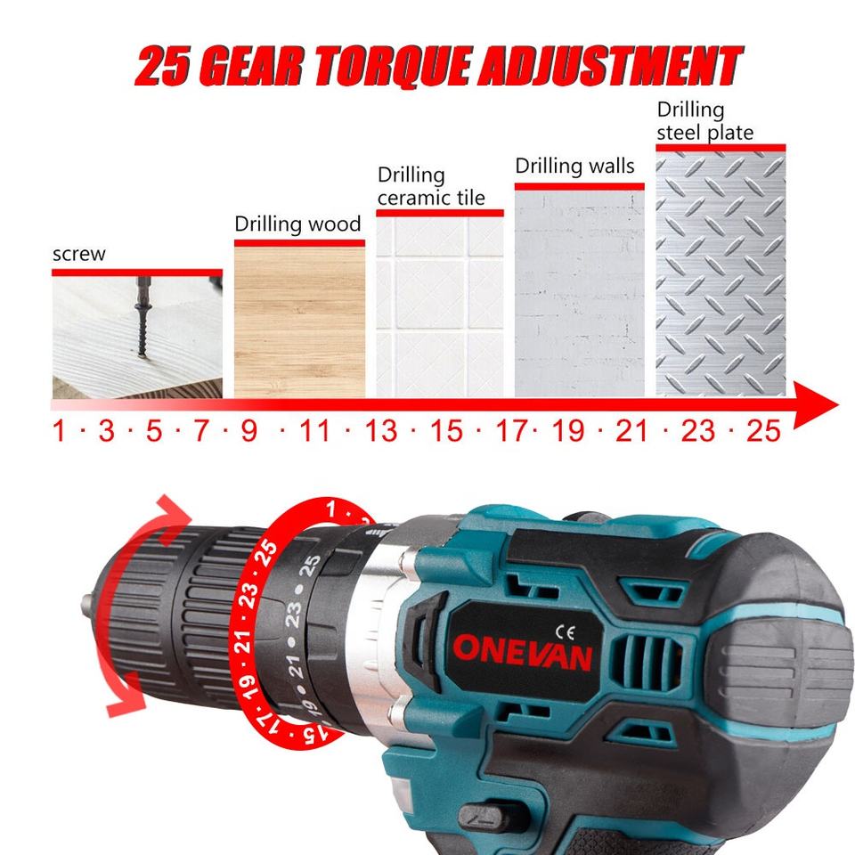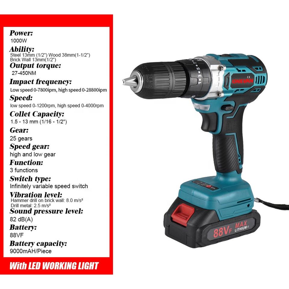 สว่านกระแทกไร้สาย 1000W 450NM แบบไร้แปรงถ่าน แรงบิด 25+3 ระดับ 3 in 1 ใช้กับแบตเตอรี่ Makita 18v