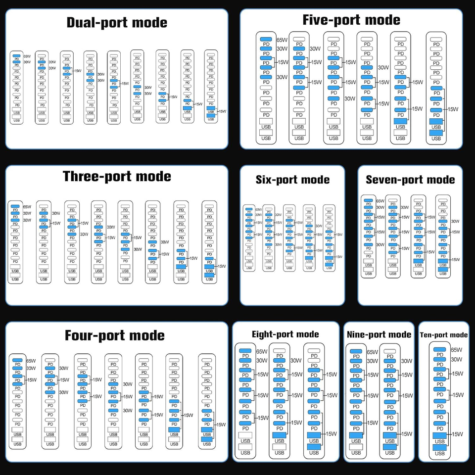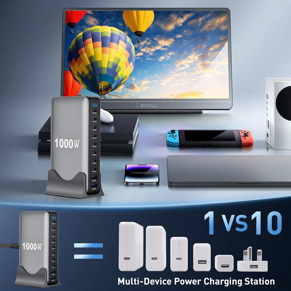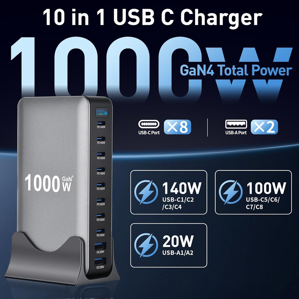 อะแดปเตอร์ชาร์จ USB C 1000W 10 พอร์ต ชาร์จเร็ว GaN PD 140W สำหรับ iPhone 17 Samsung 25
