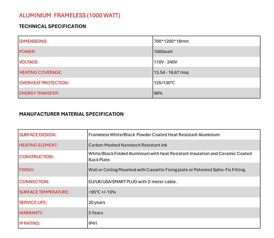 แผงทำความร้อนอินฟราเรดติดผนัง 1000W อลูมิเนียมกันน้ำ เครื่องทำความร้อนโยคะร้อน ป้องกันความร้อนเกิน สมาร์ทโฮม