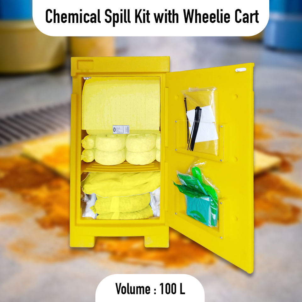 ชุดอุปกรณ์ดูดซับสารเคมีขนาด 100 ลิตร พร้อมรถเข็นแบบมีล้อ ชุดดูดซับสารเคมีเคลื่อนที่สำหรับงานหนัก สำหรับของเหลวอันตราย ความปลอดภัยในคลังสินค้าอุตสาหกรรม