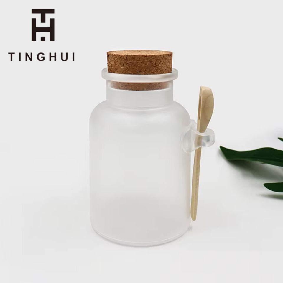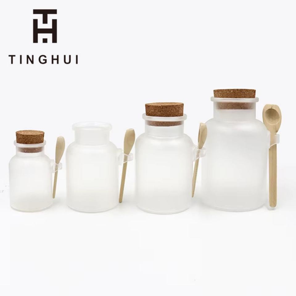 ขวดใส่เกลืออาบน้ำแบบเปล่า ขนาด 100 กรัม 200 กรัม 300 กรัม 500 กรัม (3 ออนซ์ 7 ออนซ์ 10 ออนซ์ 16 ออนซ์) ภาชนะพลาสติกใสฝ้าสำหรับใส่อาหาร พร้อมฝาไม้และช้อน