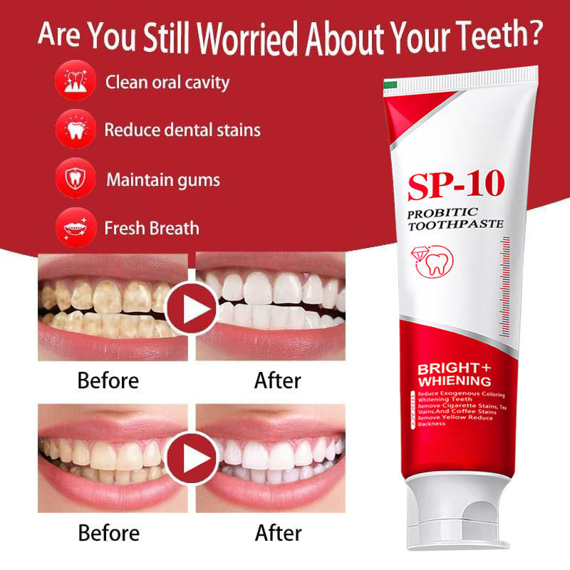 ยาสีฟันโปรไบโอติก SP-10 ไบรท์ ไวท์เทนนิ่ง ลดคราบฟัน ลมหายใจหอมสดชื่น มิ้นท์ สำหรับสุขอนามัยช่องปากประจำวัน 120 กรัม