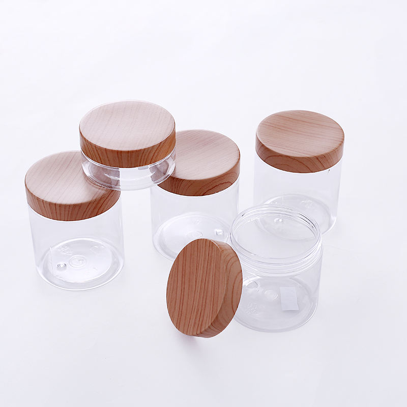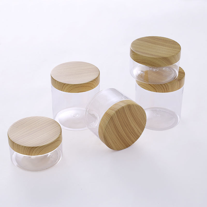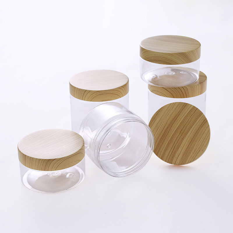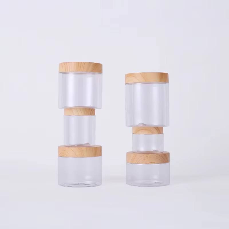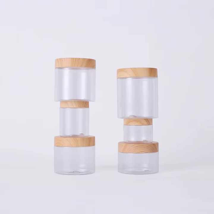 ขวดใสสำหรับเครื่องสำอางขนาด 100 มล., 150 มล., 200 มล., 250 มล. ทำจากพลาสติก PET สำหรับบรรจุสครับขัดผิว พร้อมฝาพลาสติกแบบไม้