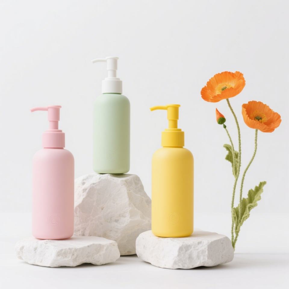 Macaron colored shampoo bottle