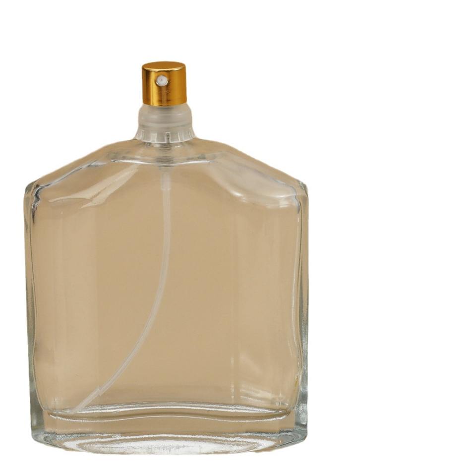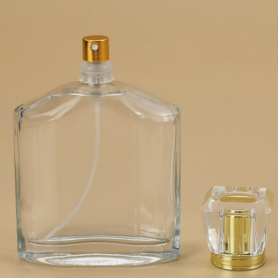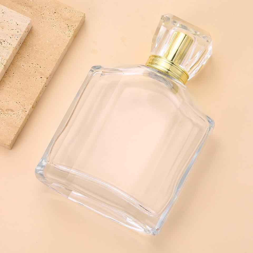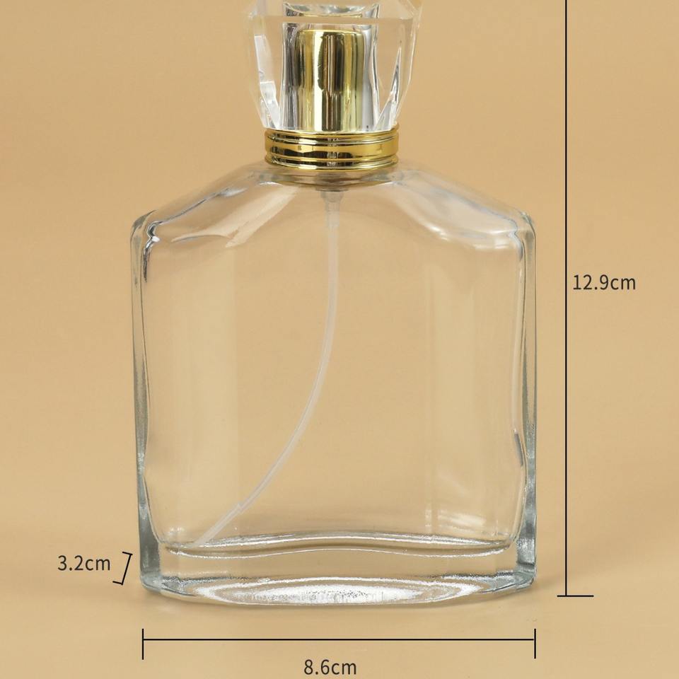 ขวดน้ำหอมแก้วใสขนาด 100 มล. คอขวดแบบ Crimp ความจุมาก หัวฉีดพ่นละอองละเอียด ขวดเติมได้สำหรับเครื่องสำอาง