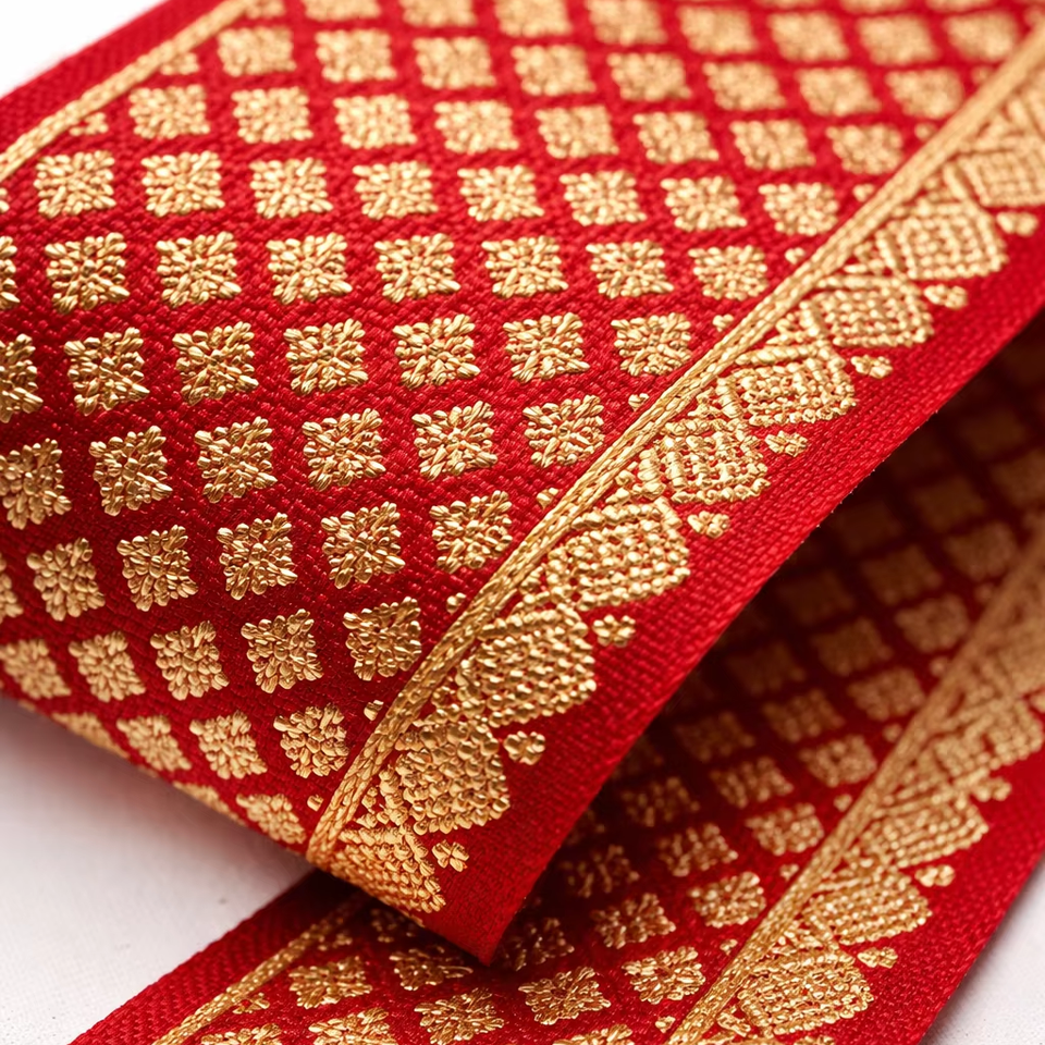 ริบบิ้นผ้าแจ็คการ์ดสีแดงขนาด 100 มม. ผลิตจากโพลีเอสเตอร์ 100% ทนต่อการหดตัว ลายทอแบบชาติพันธุ์ สำหรับตกแต่งขอบผ้าส่าหรีและเสื้อผ้าดีไซเนอร์
