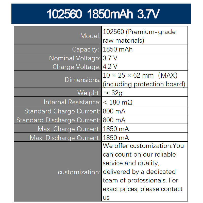 102560 1850mAh 3.7V (วัตถุดิบเกรดพรีเมียม) ผู้ผลิตแบตเตอรี่ลิเธียมโพลิเมอร์แบบกำหนดเอง เซลล์ลิเธียมโพลิเมอร์ อุปกรณ์อิเล็กทรอนิกส์ ใบรับรองความปลอดภัย (MSDS)