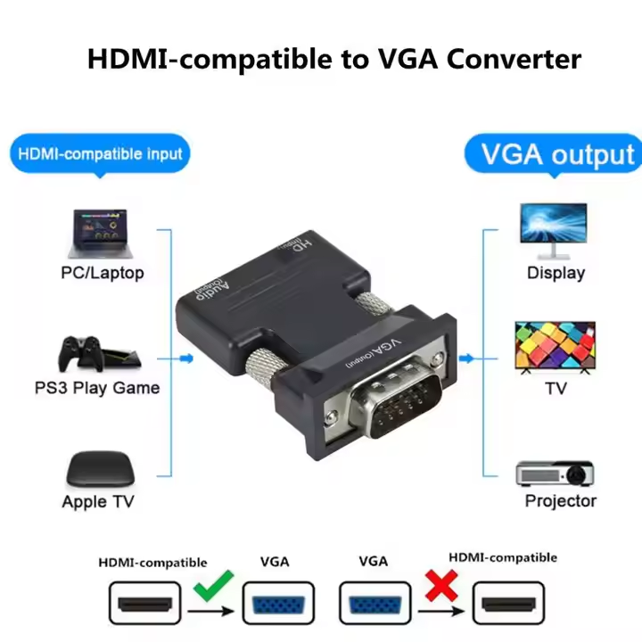 ตัวแปลงวิดีโอ 1080P สำหรับ HDMI ตัวเมีย เป็น VGA ตัวผู้ พร้อมสายอะแดปเตอร์เสียง 3.5 มม. AUX สำหรับพีซี แล็ปท็อป ทีวี จอภาพ โปรเจคเตอร์ สายโคแอกเชียล PVC