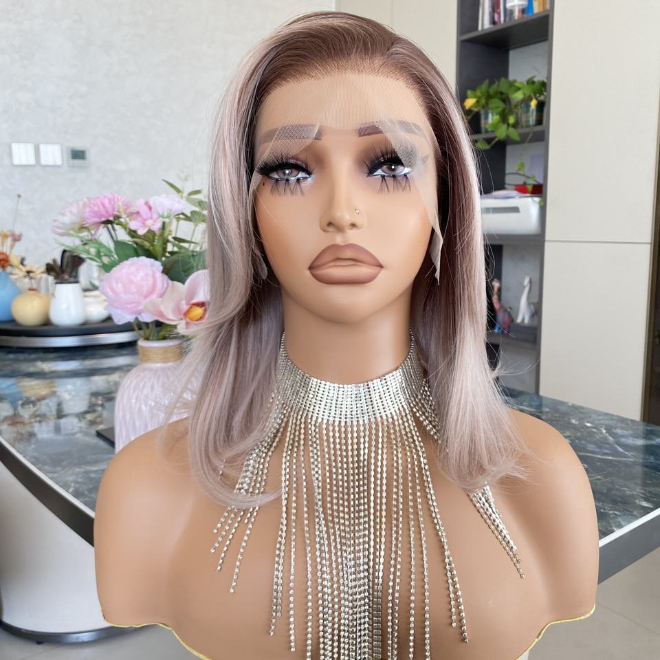 วิกผมบ๊อบสั้น 10 นิ้ว แบบลอนคลื่น สีชมพูอ่อน ไม่ต้องใช้กาว วิกผมสังเคราะห์ทนความร้อนสูง พร้อมลูกไม้ HD ให้ลุคดูเป็นธรรมชาติ สำหรับผู้หญิง
