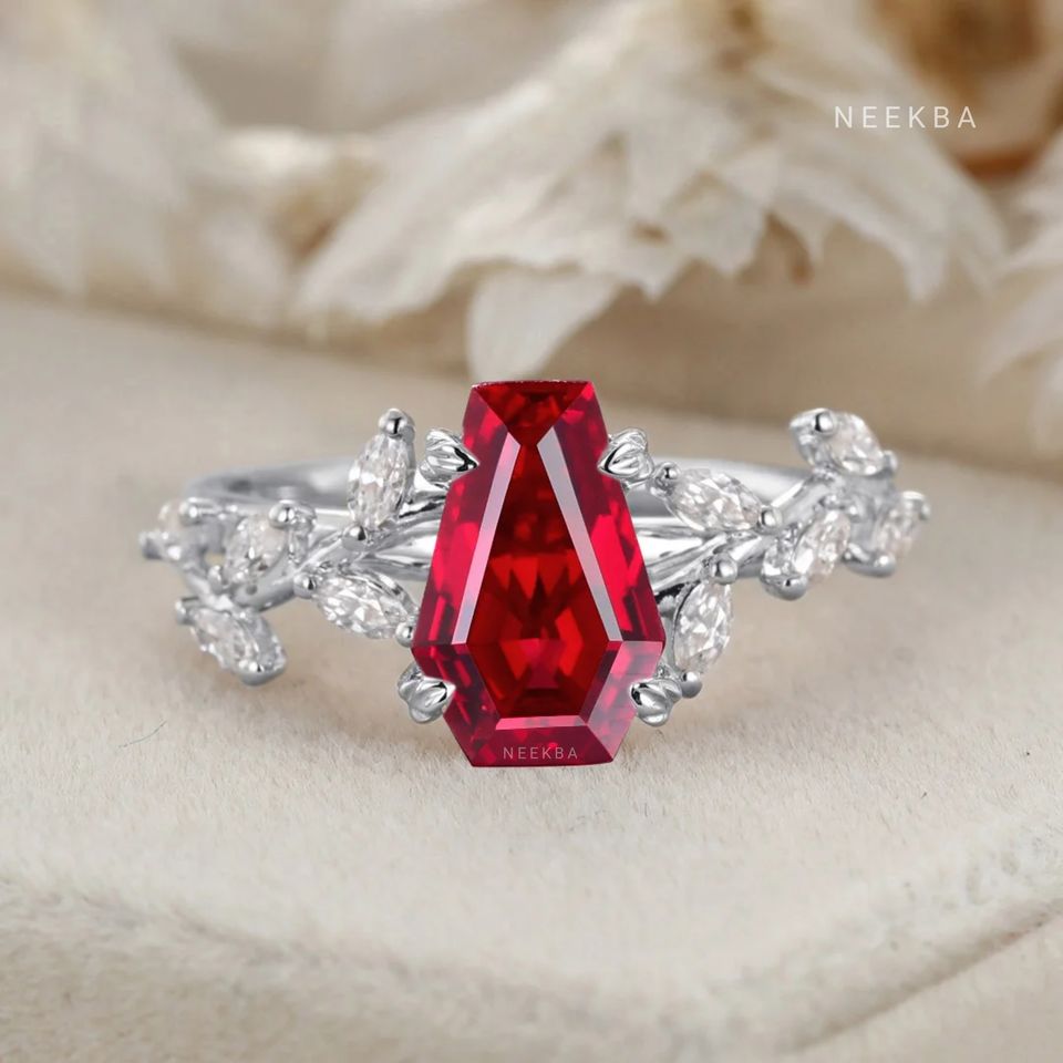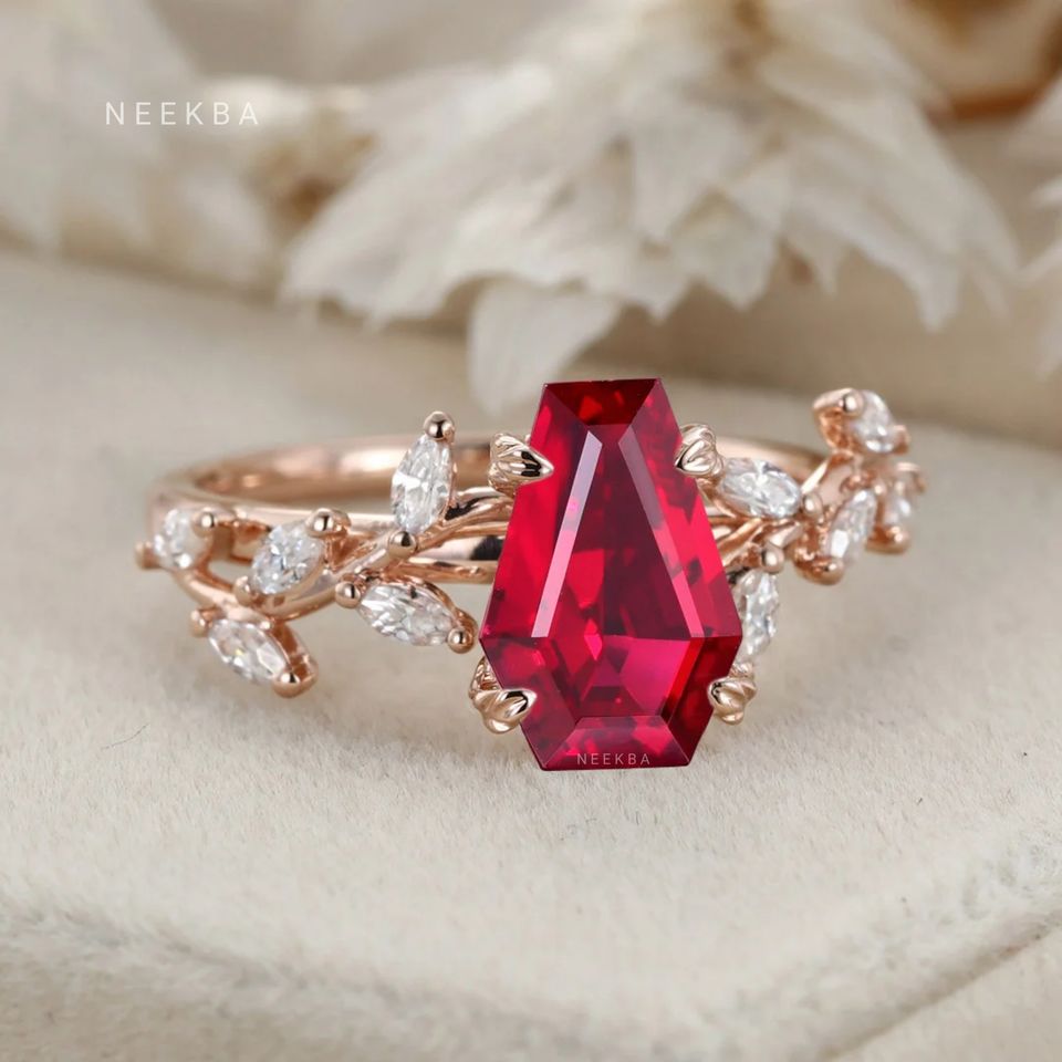 10K แหวนทองคำแท้สไตล์อาร์ตเดคโคสไตล์โลงศพที่ได้รับแรงบันดาลใจจากธรรมชาติแหวนหมั้นทับทิมสำหรับปลูกในห้องแล็บแหวนโลหะปรับแต่งโทนสี/ความบริสุทธิ์ได้ตามต้องการ